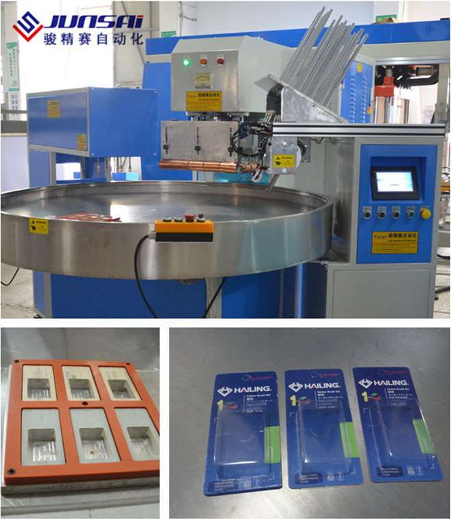 機(jī)械手六工位吸塑包裝機(jī)利用高頻熱合的原理,通過高周波模具加熱工件,到達(dá)塑料同塑料的熔接、塑膠同紙卡,或紙卡同紙卡的塑接,被熔接的紙卡通常在印刷時(shí)表面被涂上一層PVC或APET、PETG的膠水,在高周波的作用下熔為一體。