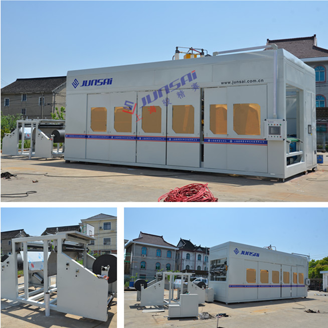 全自動雙層厚片吸塑機系列產品是采用國外技術及工藝技術,結合國內市場實際需求,研發生產的新型全自動厚片吸塑設備,該機采用PLC、觸摸屏自動控制系統,模塊控溫系統,自動鎖模系統,可靠性強,功能性好,自動化程度高,操作簡單,自動對位上料,自動取成品,大大提高了生產效率。加熱系統采用英國鹵素短波加熱器,短波遠紅外加熱器優勢;紅外線長波,加熱均勻,滲透性強,反射效果好,加熱速度快(光熱同步),耗能低。